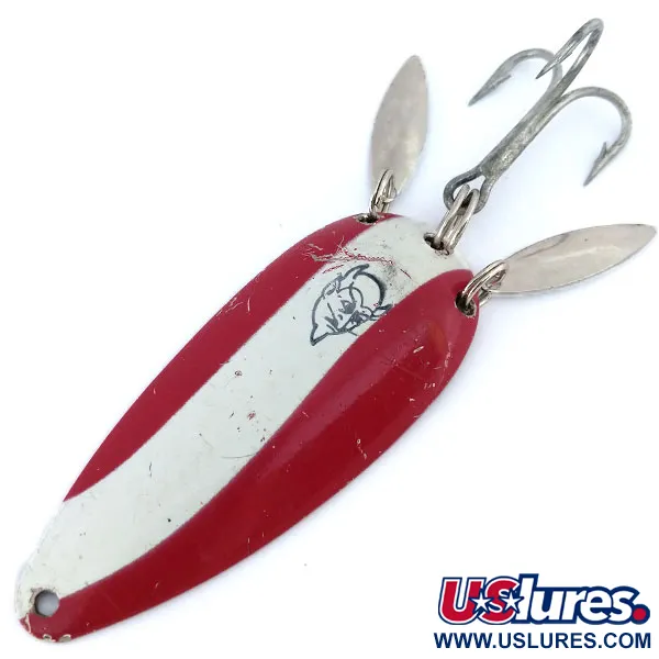 Podlouhlé tělo této plandavky o délce 7 cm (2 3/4") je vyvedeno v legendárním vysoce kontrastním červeno-bílém pruhovaném vzoru. Tento nahazovací nástroj o hmotnosti 21 g (3/4 oz), vedený pod produktovým kódem 11062, zdobí charakteristické logo černé hlavy ďábla vyražené přímo na středovém bílém pruhu. To, co dělá Eppinger Dardevle Dardevlet Klicker jedinečným, je přidání dvou niklových akustických lamel ve tvaru slzy připevněných k zadnímu kroužku. Tyto lamely jsou navrženy tak, aby během navíjení klapaly o plandavku a o sebe navzájem, čímž dodávají vizuálnímu záblesku mechanický zvukový prvek. Zadní strana nástrahy má povrchovou úpravu z leštěného niklu, kde je do kovu vyražena značka výrobce. Celkově je tento kus v dobrém stavu, vykazuje pouze lehké povrchové škrábance a drobné oděrky barvy odpovídající hodnocení stavu 4/5. Osazení zůstává robustní a obsahuje standardní stříbrný trojhák připravený k lovu nebo do sbírky. Designy Lou Eppingera pocházející z Michiganu zůstaly po desetiletí v podstatě nezměněny a spoléhají na tuto specifickou konkávní geometrii pro zachycení světla.