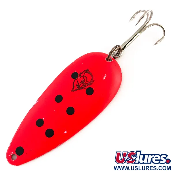 Zářivě červený lak doplněný pěti výraznými černými tečkami definuje vizuální charakter této klasické plandavky o hmotnosti 21 g (3/4 oz). Tento model Dardevle Dardevlet UV, označený kódem produktu 8248, je speciálně navržen s fluorescenční úpravou, která intenzivně září při vystavení UV světlu, což představuje moderní evoluci odkazu značky Eppinger z Detroitu. Nástraha o délce 7 cm (2 3/4") nese na své konvexní straně charakteristické vyražené logo ďábla. Zadní strana je v provedení z leštěného niklu, což vytváří ostrý záblesk doplňující jasně červenou horní stranu. Konstrukce využívá vlastní formy výrobce, což má za následek specifický konkávní profil, který zůstává stálicí v rybářských boxech již od počátku 20. století. Osazení tvoří robustní kroužek a ostrý trojháček. Stav tohoto exempláře je hodnocen jako 5/5 a je výjimečný, lak i kovový povrch nevykazují žádné známky stáří nebo používání. Tato konkrétní barevná kombinace je vysoce funkční v přikalené vodě, kde UV vlastnosti a kontrast niklu zajišťují vysokou viditelnost.