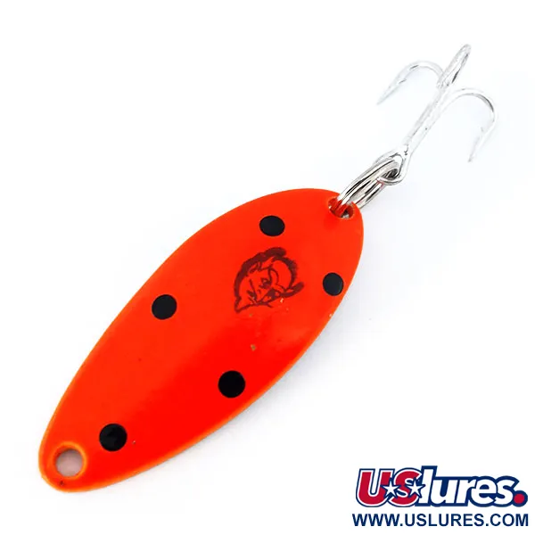 Leštěný nikl pokrývá zadní stranu této 4cm plandačky a poskytuje jasný kovový lesk, který doplňuje výraznou lakovanou přední stranu. Tato plandačka Devle Dog 5200 UV s produktovým kódem 10931 má povrchovou úpravu ve vysoce viditelné fluorescenční červené barvě s pěti výraznými černými tečkami obklopujícími klasickou ražbu ďábelské hlavy Eppinger. Kovové tělo o hmotnosti 7 g je navrženo pro vyvážené nahazování a dlouhou životnost. Povrchová úprava nástrahy reaguje na UV záření a pod ultrafialovým světlem mění barvu na hlubokou, zářivou oranžovo-červenou, což napomáhá viditelnosti v kalné vodě nebo za slabého osvětlení. Ostrý stříbrný trojháček je k zadní části připevněn pevným kroužkem, zatímco v přední části je čisté očko pro navázání vlasce. Tento konkrétní kus je v nepoužitém stavu a vypadá přesně tak, jako když opustil továrnu v Michiganu.