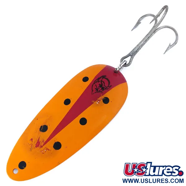 Tato těžká plandavka o hmotnosti 58 g (2 oz) patří do legendární série 700, což potvrzuje jasné ražení na poniklované zadní straně. Tato Eppinger Dardevle Huskie Junior, vedená pod kódem produktu 10729, měří 11,5 cm (4 1/2") a pyšní se zářivě oranžovým lakem s černými tečkami. Středu dominuje klasický červený pruh ve tvaru slzy s výrazným logem černé ďábelské hlavy, symbolem detroitské společnosti založené Lou Eppingerem v roce 1906. Vyrobeno v USA pomocí vlastních matric, konkávní tělo je navrženo pro nahazování do hlubokých vod, kde číhají velcí dravci. Na zadní straně je vyraženo „700 SERIES 2 OZ EPPINGER DARDEVLE MADE IN U.S.A.“, což zdůrazňuje dlouhou historii výroby v Dearbornu. Tento exemplář je ohodnocen stavem 4/5, vykazuje lehké povrchové opotřebení a drobné oděrky laku na přední straně, ačkoli poniklování zůstává lesklé. Velký stříbrný trojháček vykazuje mírné známky stáří, ale zůstává strukturálně v pořádku.