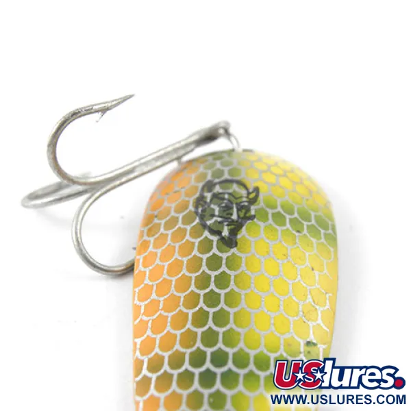 Tato plandavka o hmotnosti 11 g (2/5 oz) je všestrannou volbou pro přívlač i trolling v různých vodních podmínkách. Vnější strana této Dardevle Imp, označená produktovým kódem 1183, se vyznačuje zářivou oranžovo-žlutou barevnou paletou doplněnou stříbrným vzorem včelí plástve a jemným zeleným akcentem u hlavy. Na zadní straně leštěného stříbrného konkávního povrchu je ostrá, hluboká ražba „DARDEVLE IMP U.S.A.“, která je symbolem výrobního dědictví společnosti Eppinger v Michiganu. Kapkovitý profil o délce 5,5 cm (2 1/4") je vyražen z masivního kovu pro zajištění stability při vedení. Výbavu tvoří klasický stříbrný trojháček upevněný v základně pomocí kroužku. Tento exemplář si zachovává svůj původní lesk a jeho stav je hodnocen stupněm 5/5, což odráží velmi zachovalý stav vhodný do sběratelské vitríny.