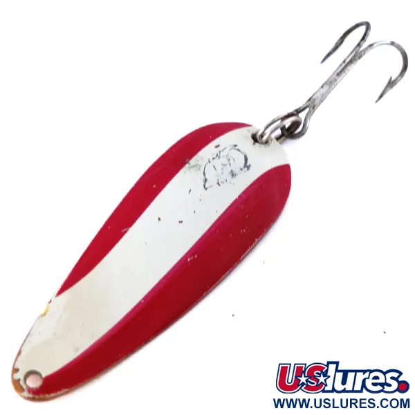 Červené a bílé smaltované pruhy zdobí lícovou stranu této klasiky, což je vzor, který zůstává základem rybářských boxů po celé generace. Tato plandavka Eppinger Dardevle Imp Copper Back, označená kódem produktu 10645, váží 11 g (2/5 oz) a měří 5,5 cm (2 1/4"). Výrazný nátěr na konkávní straně je spárován s čistě měděnou zadní stranou, což je specifická konfigurace oblíbená pro zajištění teplého, jemného odlesku v přikalené vodě. Při bližším pohledu zůstává ražba „DARDEVLE IMP U.S.A.“ na zadní straně hluboká a jasná. Třpytka je ve stavu 5/5, vykazuje lesklý, čistý povrch a minimální známky stáří. Osazení zahrnuje robustní trojháček zajištěný pevným kroužkem, což odráží americkou kvalitu, kterou je značka Eppinger proslulá. Kovové tělo má na svou velikost značnou hmotnost, což napomáhá dalekým náhozům ve větrných podmínkách.