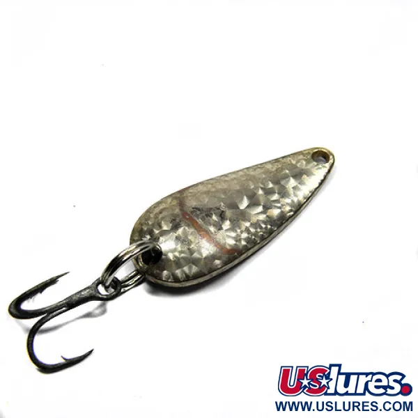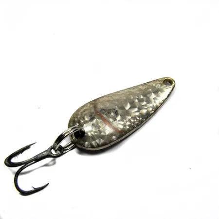 Tepaná textura zachycuje světlo na povrchu Crystal silver scale této 3cm (1 1/4") plandavky. Tato Eppinger Lildevle s označením kódu produktu 0341 nese na zadní straně klasickou ražbu Detroit U.S.A., což je detail odkazující na původ z michiganské dílny založené Lou Eppingerem. Při hmotnosti 3,4 g (1/8 oz) výbavu tvoří robustní trojháček spojený pevným kroužkem. Nástraha je ve stavu 4/5, s dobře zachovalým pokovením a čistými ražbami. Konkávní tvar těla je navržen pro výrazný kolísavý pohyb při plynulém přitahování, díky čemuž je základem pro nahazování v čisté i kalné vodě. Texturovaná lícní strana má napodobovat záblesky malých rybek, což je konstrukční princip, který Eppinger využívá již od počátku 20. století.