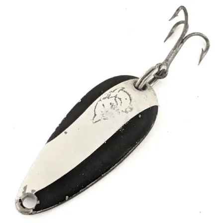 Tato vintage plandavka o hmotnosti 6 g (3/16 oz) představuje řemeslnou zručnost, kterou Lou Eppinger přinesl do rybářského světa ze své dílny v Michiganu. Přední strana této 3,5 cm (1 1/2") nástrahy se vyznačuje výrazným diagonálním barevným schématem, kde čistý bílý pruh prochází mezi dvěma sytě černými poli. Na tomto bílém pruhu je výrazně umístěno reliéfní logo delfína, jemný ukazatel bohaté výrobní historie značky. Po otočení nástrahy se objeví ražba „DARDEVLE MIDGET U.S.A.“ vtisknutá přímo do leštěného niklového podkladu. Tento konkrétní exemplář, vedený pod produktovým kódem 12850, je ve stavu 5/5, přičemž si zachovává svůj původní lesk a ostré linie laku. Je osazena původním trojháčkem a kroužkem, připravená do sbírky nebo pro lov na lehkou přívlač. Očko pro navázání je přesně vyraženo na užším konci, což podtrhuje preciznost vlastních raznic používaných při výrobě v USA.