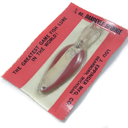 Tato klasická plandavka o hmotnosti 7 g (1/4 oz) se pyšní červenobílým provedením, které po generace definuje značku Eppinger. Tento model Dardevle Spinnie s produktovým kódem 2002 měří 4,5 cm (1 3/4 palce) a je dosud nepoužitý v původním balení z Dearbornu v Michiganu. Nález exempláře stále zataveného v blistru nabízí autentický pohled na originální tovární osazení a výraznou ražbu hlavy ďábla u očka pro vlasec. Kovové tělo je vytvarováno pomocí speciálních matric, které zajišťují vyvážení nezbytné pro daleké hody. Adresa Dearborn na kartě pomáhá datovat tento kousek do éry po přestěhování společnosti z Detroitu v roce 1959. Smalt zůstává na podlouhlém kovovém povrchu sytý a nevykazuje žádné známky stáří ani opotřebení skladováním.