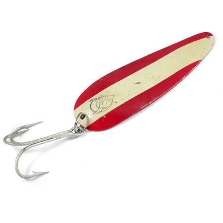 Hmotnost 40 g dodává této trollingové plandavce dostatečnou masu pro dosažení značných hloubek při lovu velkých dravců. Dardevle Trolldevle o délce 11,5 cm, s kódem 2060, je významným kusem historie značky Eppinger. Přední strana se vyznačuje klasickým červeno-bíle pruhovaným smaltem s rozpoznatelnou grafikou hlavy ďábla natištěnou na středovém pruhu. Zadní strana odhaluje leštěný niklový povrch s ražbou „TROLLDEVLE DETROIT USA“, což je přímý odkaz na dlouhou výrobní historii společnosti v Michiganu. Osazení tvoří jeden velký trojhák zajištěný v zadní části vysoce odolným kroužkem. Tento exemplář je v dobrém stavu, hodnocený 4/5, vykazuje mírnou ztrátu barvy a drobné povrchové škrábance podél okrajů a bílého pruhu, což je pro nástrahu tohoto stáří typické. Konkávní tvar plandavky je navržen tak, aby při tažení vodou vytvářel kolébavý chod.
