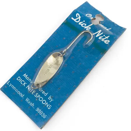 Tato plandavka Dick Nite #1 o délce přesně 1" (2,5 cm) má tenký kovový profil s jasným, klasickým niklovým povrchem. Vyrobena v USA společností Dick Nite Spoons pod produktovým kódem 4939, tento exemplář odráží tradiční výrobní styl z Lynnwoodu ve státě Washington. S muší váhou 1/32 oz (1 g) je určena pro lehkou přívlač nebo trolling v situacích, kdy je vyžadován malý profil nástrahy. Zůstává v nepoužitém stavu, stále připevněna k originálnímu modrému kartonovému obalu se značkou „Original Dick Nite“. Povrch plandavky je čistý a reflexní, s jednoháčkem upevněným v zadním očku.