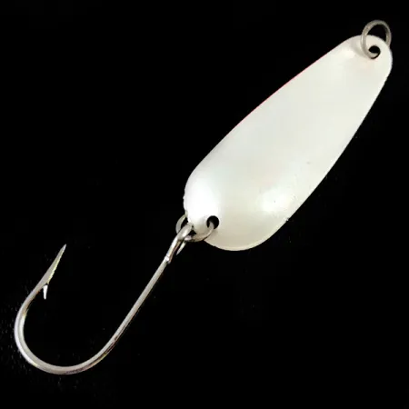 Tato klasická plandavka z tenkého kovu o hmotnosti 1,7 g (1/16 oz) představuje základ rybářského dědictví severozápadního Pacifiku. Tělo o délce 3,5 cm (1 1/2") je z jedné strany opatřeno povrchem White Pearl a z druhé strany barvou Fluorescent Red UV Glow, což je kombinace navržená pro vysokou viditelnost a prezentaci v hlubokých vodách. Tento exemplář, registrovaný pod kódem 4874, byl vyroben v USA společností Dick Nite Spoons, značkou známou svým specializovaným vybavením pro trolling a lov na plavačku. Nástraha je osazena ostrým jednoháčkem připevněným přes kroužek a malým očkem na špičce, které podporuje její charakteristický kolísavý pohyb. Tento kus je ve stavu 5/5, přičemž si zachovává čistý povrch a integritu původního UV reaktivního nátěru.