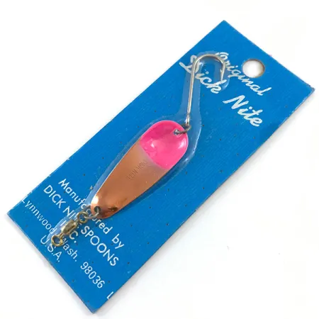 Měděný kov se u této vintage plandavky snoubí s výraznou růžovou špičkou, což je barevná kombinace často vyhledávaná pro svou viditelnost v různých světelných podmínkách. Dick Nite #2 váží jemných 1/16 oz (1,7 g) a měří přesně 1 1/2" (3,5 cm). Tento kus s produktovým kódem 5316 je v nepoužitém stavu, stále připevněný k originální modré kartě „Original Dick Nite“. Balení potvrzuje jeho původ, vyrobeno společností Dick Nite Spoons Inc. v Lynnwoodu ve státě Washington, USA. Nástraha je v přední části vybavena integrovaným obratlíkem v mosazném tónu pro navázání vlasce a v zadní části ostrým jednoháčkem. Měděný povrch zůstává lesklý a reflexní, což kontrastuje s plnou růžovou barvou, která pokrývá horní třetinu kovového těla. Tento konkrétní model představuje klasickou éru designu rybářského náčiní z amerického severozápadu, která sází na funkční komponenty a poctivé americké řemeslo.