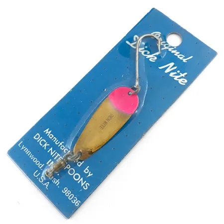 Zářivě růžová barva hlavy této mosazně tónované plandavky vytváří vysoce kontrastní cíl pro pstruhy i lososy. Tato plandavka velikosti #2 o délce 3,5 cm (1 1/2") a hmotnosti 1,7 g (1/16 oz) je klasikou z amerického severozápadu. Vyznačuje se tradičním profilem Dick Nite s jednoháčkem, který je v zadní části zajištěn pevným kroužkem. Na kovovém těle je přímo uprostřed pozlaceného povrchu vyražen název „DICK NITE“. Tyto plandavky jsou určeny pro lehké vybavení a obvykle se používají k trollingu nebo k přívlači v říčních systémech, kde je vyžadován jemný záblesk. Nález exempláře v původním modrém balení „Dick Nite Spoons“ z Lynnwoodu ve státě Washington je pro sběratele lahůdkou; tento konkrétní kus je nepoužitý a zůstává ve vynikajícím stavu. Vyrobeno v USA; adresa Lynnwood na obalu odkazuje na dlouholetou tradici značky v rybářském světě státu Washington.