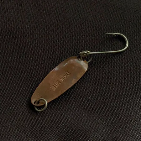 Tato měděná plandavka s vyraženým názvem „DICK NITE“ na své konkávní straně je typickým příkladem amerického náčiní ze státu Washington. S hmotností pouhých 1/32 oz (1 g) a délkou 1" (2,5 cm) je určena pro ultralehkou přívlač, kde je vyžadován drobný profil nástrahy. Povrchová úprava z čisté mědi nabízí specifický, přirozený lesk, který se liší od vysoce lesklého chromování nebo stříbření. Výbava zahrnuje jeden jednoháček typu siwash s velkým obloučkem, připevněný pomocí kroužku. Tato konfigurace je často preferována pro lov pstruhů nebo lososů nerka (kokanee) v tekoucích vodách. Druhý kroužek v přední části slouží jako spolehlivý bod pro navázání jemných návazců nebo připnutí obratlíků. Plandavka s produktovým kódem 22940 je ve stavu 4/5, s dobře zachovalým kovovým povrchem a pevnými spojovacími body.