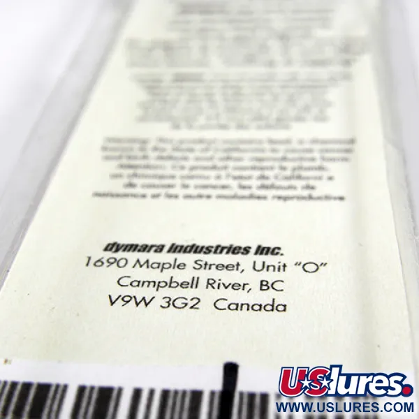 Tato kanadská plandavka měří přesně 4,5 cm (1 3/4") a vyznačuje se klasickým vzorem okouna s výraznými zlatými šupinami a zářivým červeno-oranžovým akcentem směrem k ocasu. Tento konkrétní model Slim — s produktovým kódem 0836 — vyrobila společnost Dymara Industries z Campbell River v Britské Kolumbii a jde o pozoruhodný kousek od výrobce, který již ukončil výrobu. Nástraha váží 8 g (1/4 oz) a je konstruována pro všestranné použití včetně nahazování, trollingu a jiggingu. Přední část plandavky je osazena pevným obratlíkem, zatímco zadní strana má čistý, vysoce viditelný chromový povrch. Předmět je v nepoužitém stavu, uchovaný v původním továrním obalu, na kterém je stále uvedena adresa společnosti.