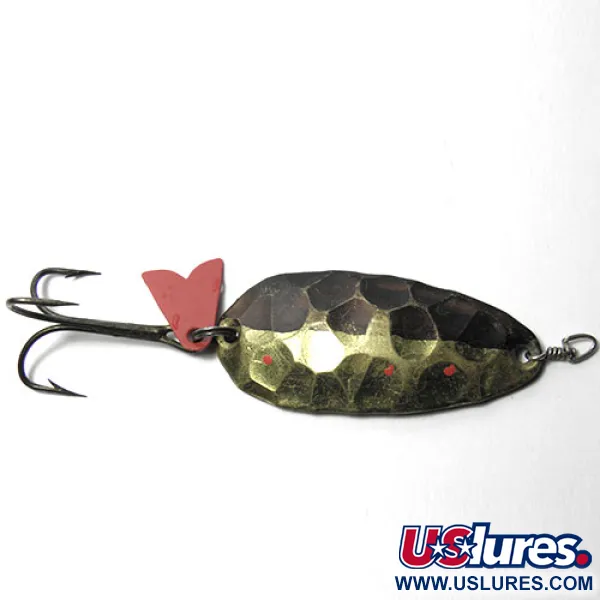Ručně vyklepávané prohlubně na mosazném těle definují texturu této plandavky EGB, což je charakteristický znak švýcarské řemeslné výroby. Kov o hmotnosti 1/3oz (9,5g) a délce 1 3/4" (4,5cm) má dvoubarevnou povrchovou úpravu podélně rozdělenou na leštěnou mosaz a tmavě hnědý lak. Na mosazné polovině jsou v tepaných ploškách umístěny tři malé červené tečky pro větší kontrast. Zadní strana jasně vykazuje vyražené logo EGB a nápis „SWISS MADE“ přímo v kovu. Červené plastové lákadlo ve tvaru srdce je upevněno na zadním kroužku těsně nad trojháčkem. Tato nástraha s produktovým kódem 0003 má stav 4/5, což odráží její čas strávený v rybářském kufříku, přesto zůstává skvělým kouskem do vintage sbírky. Mosazný materiál nabízí dostatečnou hmotnost pro nahazování do hlubších tůní.