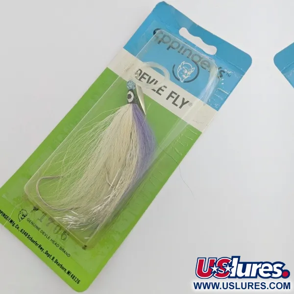 Fialová a bílá srst z jelena (bucktail) tvoří hlavní vizuální profil této specializované trollingové sestavy, která představuje spojení mezi tradiční plandavkou a muškou. Výrobek společnosti Lou J. Eppinger Mfg. Co. z Dearbornu v Michiganu, Devle Fly, využívá volně rotující kovovou lopatku na ose, která při tažení vytváří záblesky. Tento exemplář s kódem produktu 24438 má niklovanou lopatku v kombinaci s háčkem zdobeným bílou a fialovou srstí. Je určen pro hlubinný trolling, často se používá ve spojení s flasherem nebo atraktorem při lovu sivenů obrovských a jiných lososovitých ryb. Nástraha je v původním zeleno-modrém kartonovém obalu, je nepoužitá a má hodnocení stavu 6. Sestava obsahuje jednoháček integrovaný do bucktailu pro zachování hydrodynamického profilu. Detail namalovaného oka na olověné části mušky poskytuje rybě konkrétní bod útoku umístěný za rotující niklovou lopatkou.