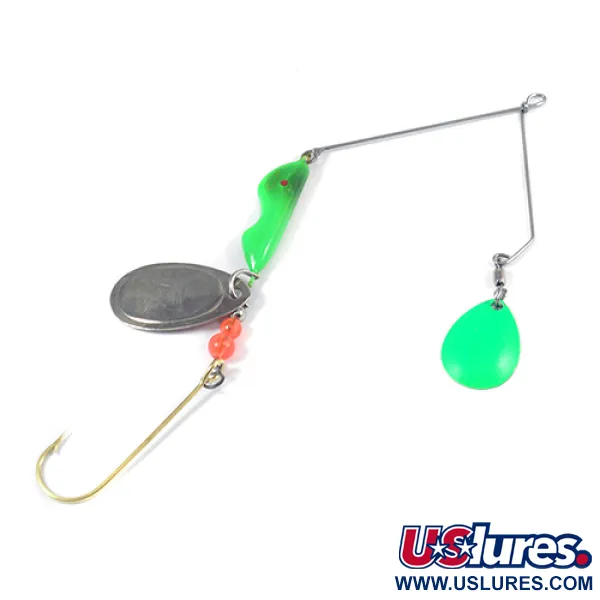 Tento v USA vyrobený Walleye Killer o hmotnosti 16 g (3/5 oz) je vybaven výrazným drátěným rámem ve tvaru L, určeným pro trolling v hlubokých vodách nebo nahazování. Hlavní list s niklovou povrchovou úpravou je jasně ražen jménem výrobce a označením hmotnosti 5/8 OZ, a je spojen s jasně neonově zeleným odlitým tělem. Druhý, menší zelený list ve tvaru kapky je k hornímu ramenu připevněn pomocí soudkového obratlíku, což vytváří druhý bod vizuálního kontrastu. Pod hlavním tělem vedou dva jasně oranžové korálky ke zlatému háčku, který zůstává ve výborném stavu. Tento exemplář ve stavu 5/5, označený produktovým kódem 2006, vykazuje pozoruhodně čisté kovové prvky a originální lak v celém barevném provedení Nikl / Zelená.