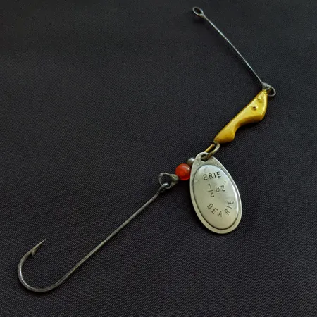Ručně malovaná v klasické kombinaci niklu a žluté barvy, tato rotační třpytka se zátěží vpředu představuje ikonický kus historie rybolovu na jezeře Erie. Olověná hlavička ve tvaru slzy má zářivě žlutou povrchovou úpravu a slouží jako hlavní zátěž této 7g nástrahy. Na rotačním listu je jasně viditelná vyražená značka: „ERIE 1/4 OZ DEARIE“, což poskytuje okamžitý důkaz pravosti pro sběratele této klasiky vyrobené v USA. Malý, průsvitný oranžový korálek je umístěn mezi žlutým tělem a stříbrným listem, čímž vytváří decentní bod zájmu, který se u těchto tradičních konstrukcí často používá. Tento exemplář s produktovým kódem 21385 je vybaven jednoháčkem s dlouhým ramínkem a nachází se ve stavu 4/5, přičemž vykazuje minimální opotřebení, které zachovává jeho autentický vintage vzhled. Drátěná konstrukce a komponenty jsou navrženy speciálně pro techniky driftování a nahazování, což zajišťuje odolnost a stabilní prezentaci.
