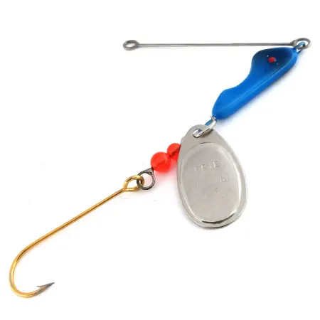Tento spinnerbait o hmotnosti 12g má výraznou zátěžovou hlavu v hluboké modré barvě s jediným červeným bodem oka. Poniklovaný list je zřetelně ražen jménem ERIE, což je znakem dědictví značky Erie Dearie v USA. Na drátěném ramínku jsou umístěny dva zářivě červené korálky, které vedou k ostrému, pozlacenému háčku s dlouhým ramínkem. Tento model, označený produktovým kódem 9929, má hodnocení stavu 5/5 a nevykazuje žádné známky používání nebo opotřebení modrého laku či kovových povrchů. Původně byl vyvinut pro driftování nad skalnatými nánosy a útesy, přičemž konstrukce se zaměřuje na odolnost a vysokou viditelnost v různých vodních podmínkách.