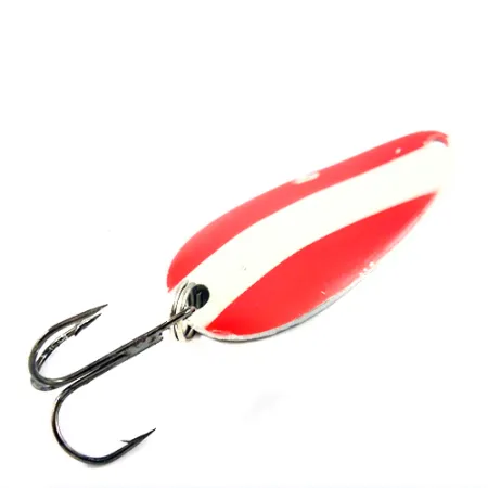 Tato kovová plandavka s klasickým červenobílým pruhovaným vzorem na vypouklé straně představuje nadčasový design z katalogu Glen Evans. Výrobce se sídlem v USA vyrazil jméno „EVANS“ do leštěného niklového povrchu na konkávní straně. S délkou 2 1/2" (6,5 cm) a hmotností 3/4 oz (21 g) má tato nástraha dostatek hmotnosti pro daleké nahazování nebo trolling. Je osazena silným trojháčkem připevněným pomocí robustního kroužku v zadní části. Celkový stav je solidní 4/5, vykazuje pouze mírné známky používání, přičemž barva i lesk kovu zůstaly zachovány. Tento konkrétní model je v katalogu uveden pod kódem 2907. Niklová zadní strana poskytuje vysoce kontrastní odlesky proti výrazným červeným a bílým pruhům na horní straně.