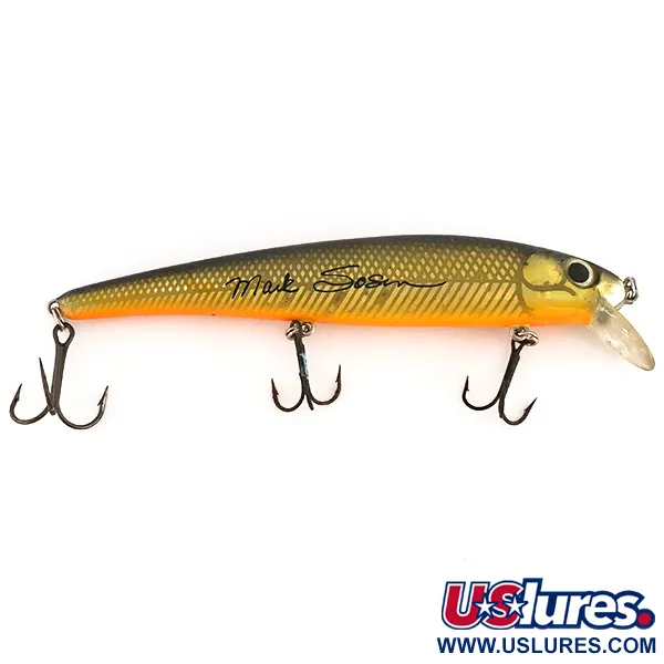 Tento štíhlý jerkbait o délce 12 cm (4 3/4") představuje pozoruhodný kus historie z doby před akvizicí značky XCalibur společností Heddon. Tento signovaný model Mark Sosin nese na boku kurzivou psané jméno legendárního rybáře spolu se specifickým kódem produktu 7646. Povrchová úprava se vyznačuje detailním vzorem zlatých šupin na hřbetě a vysoce viditelným oranžovým břichem, v původním katalogu označeným jako barva 3. Při hmotnosti 12 g (2/5 oz) je nástraha konstruována jako vznášivá (suspending), takže při zastavení zůstává v neutrální poloze ve vodním sloupci. Výbava zahrnuje tři trojháčky z černého niklu a robustní, čiré potápivé lopatky vyladěné pro rozsah hloubek 0,9 - 1,5 m (3 - 5 ft). Nástraha je ve výjimečně zachovalém stavu (hodnocení 5/5) s čistým povrchem a neporušenými součástmi. Vyvinuto pro nahazování a twitching, zpracování těla odráží vysoké standardy americké výroby té doby.