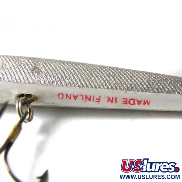 Přírodní šupinová textura se táhne po celé délce tohoto 12cm (4 3/4") minnow wobleru a odráží světlo podobně jako živá nástražní rybka. Na břiše se nachází výrazné razítko „MADE IN FINLAND“ červeným inkoustem, které jasně identifikuje řemeslné zpracování značky Finlandia Uistin. Tento exemplář s produktovým kódem 0216 má tmavě šedý hřbet, který ostře kontrastuje se stříbrnými boky a malým červeným detailem u tlamy. Wobler o hmotnosti 6 g (3/16 oz) je vybaven čirou, mělce potápivou lopatkou vhodnou pro nahazování nebo trolling v horních vrstvách vody. Osazení zůstává ve skvělém stavu, přičemž původní trojháčky přispívají k celkovému hodnocení stavu 4/5. Štíhlý profil a autentická finská konstrukce z něj dělají pozoruhodný přírůstek do sbírky evropských nástrah.