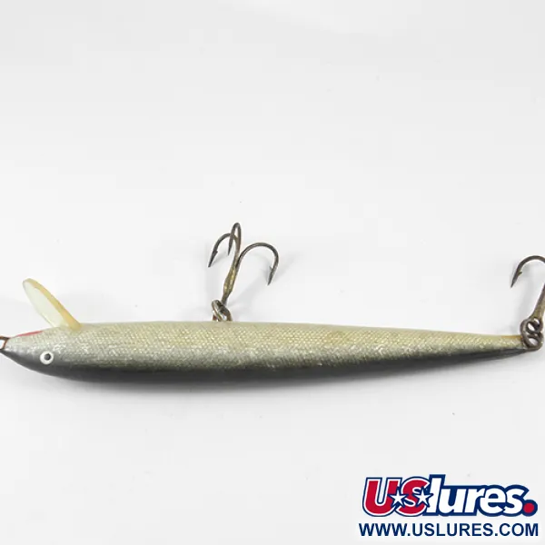 Tento finský originál definují třpytivé stříbrné a zlaté šupiny po stranách. Nástraha o délce 12 cm a hmotnosti 6 g vykazuje štíhlý profil typu minnow, který je typický pro tradiční evropský design. Společnost Finlandia Uistin, identifikovatelná podle červeného razítka „MADE IN FINLAND“ na břiše, dokončila tento exemplář v barevném provedení Natural. Gradace přechází z tmavě šedého hřbetu do světle krémového břicha, které je uprostřed doplněno hustými třpytkami. Je osazen dvěma bronzovými trojháčky a čirou, mělce potápivou plastovou lopatkou určenou pro přívlač nebo trolling. Tato konkrétní nástraha, vedená pod kódem produktu 1294, si udržuje hodnocení stavu 4/5, přičemž původní osazení i povrchová úprava zůstaly z velké části neporušené.