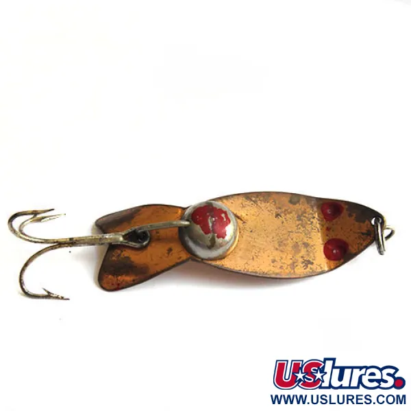 Měděný povrch těchto plandavek z poloviny století často vykazuje známky stáří s hřejivým, osobitým charakterem a tento model South Bend FLASH-ORENO (kód produktu: 0230) vyzdvihuje tento klasický kovový lesk na své délce 3" (7,5 cm). S hmotností 1 oz (25 g) je robustní konstrukce nástrahy navržena pro daleké náhozy nebo dosažení hlubších vrstev vody při trollingu. Estetika „Copper / Red“ je definována hluboce raženýma očima, která si zachovala část původního červeného pigmentu, což je charakteristický designový prvek této série vyrobené v USA. Další červeně lakovaný detail se nachází na centrálním montážním bodě, kde se kování setkává s tělem. Exemplář má aktuálně hodnocení stavu 3/5 a vykazuje viditelné opotřebení povrchu a ztrátu barvy na očích, což odráží jeho historii. Osazení zahrnuje pevný trojháček připevněný přímo k ocasní části a jednoduchý kovový kroužek na špičce pro bezpečné připojení vlasce.