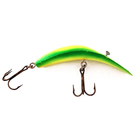 Výrazná povrchová úprava v barvách Chartreuse / Oranžová / Zelená definuje tuto klasiku od Yakima Bait, díky čemuž je nepřehlédnutelným kouskem v každé krabičce. Tento Flatfish M2, katalogizovaný pod kódem 11361, přináší výraznou prezentaci s délkou 11 cm a hmotností 17 g. Při pohledu na hardware najdete dva ostré trojháčky zajištěné robustními kovovými očky, což je důkazem odolné konstrukce, kterou je Yakima Bait proslulá. Stav tohoto konkrétního vobleru je působivých 5/5, což odráží dobře zachovaný povrch a čisté kovové součásti. Rybáři historicky upřednostňují velikost M2 pro její univerzálnost při lovu větších sladkovodních druhů, jako jsou štiky nebo jezerní pstruzi. Charakteristické banánovité tělo je vybaveno horním šroubovacím očkem pro upevnění vlasce, umístěným pro maximální účinnost při pomalém trollingu nebo plynulém přitahování. Lakování se vyznačuje jasně žlutozeleným hřbetem a břichem, které rámují tmavě lesní zelený střed, doplněný oranžovými akcenty. Tento konkrétní exemplář odráží výrobní standardy z USA a ukazuje odolnou povrchovou úpravu, díky níž zůstává Flatfish oblíbeným modelem již více než osmdesát let.