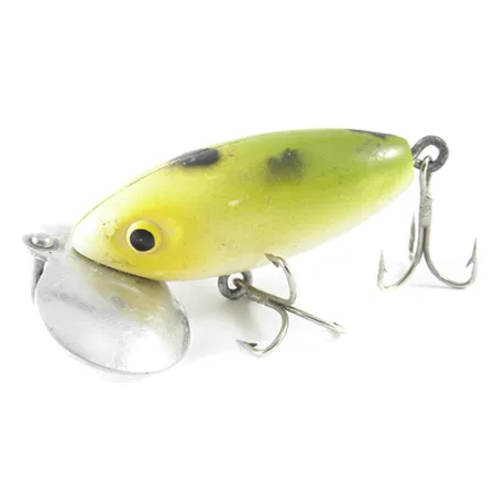 Na naddimenzované kovové lopatce je jasně vyražen původ této klasiky od Atlantic Lures – Providence, Rhode Island. Tento model Frantic Antic s produktovým kódem 1575 se vyznačuje výrazným vzorem Frog, který tvoří světle žluté břicho přecházející v zelený hřbet s výraznými tmavými kruhovými skvrnami. S hmotností 6 g (3/16 oz) a délkou 5 cm (2") se jedná o hladinový popper, který využívá svou širokou přední desku k interakci s vodou. Osazení zahrnuje dva trojháčky a horní očko pro upevnění vlasce. Stav je hodnocen 4/5, přičemž lakovaný povrch zůstává hladký a kovové části vykazují minimální známky stáří. Velká kovová lopatka je pevně zajištěna dvěma zapuštěnými šrouby, což zajišťuje, že branding Atlantic Lures zůstává ústředním bodem.