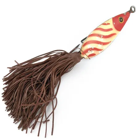 Tato 16g (3/5 oz) nástraha, dostatečně těžká pro přesné nahazování do vázek, představuje klasický kousek americké rybářské historie z dílen Freda Arbogasta. Povrchová úprava se vyznačuje výraznou červenou hlavou a tělem zdobeným zřetelnými vlnitými červenými pruhy na stříbrném podkladu. S délkou 6 cm (2 1/4") je osazena ikonickou hnědou gumovou třásní, která definovala řadu Hula a je navržena tak, aby zůstala poddajná pro sběratelské účely. Pod produktovým kódem 22097 je tělo typu plandavka postaveno kolem jednoho nahoru směřujícího nezachytávajícího háčku, což je konstrukce určená specificky pro lov v leknínech a husté vegetaci. Tento kus je ve stavu 4/5, vykazuje lehké povrchové stopy, které podtrhují jeho autentický vintage původ, zatímco barvy zůstávají syté. Oko je detailně zpracováno se zlatou duhovkou a černou zornicí, což je typický prvek z éry americké produkce.