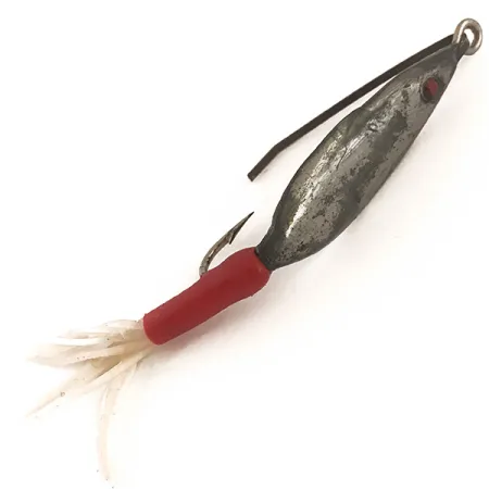 Tato nástraha Hawaiian #3 s těžkým olověným tělem o hmotnosti 8 g (1/4 oz) je navržena speciálně pro lov v husté vegetaci. Tento exemplář s produktovým kódem 4743 je vybaven originální drátěnou ochranou proti váznutí, která vychází z očka pro vlasec a směřuje k hrotu háčku, čímž zabraňuje uváznutí v překážkách. Ramínko háčku kryje zářivě červená bužírka, která vytváří výrazný kontrast ke stříbrnému tělu a přechází v bílé gumové střapce. Nástraha o délce 4,5 cm (1 3/4") si zachovala původní červeně malované oko u hlavičky a vyražené logo výrobce na zadní straně. Kovový povrch vykazuje mírné opotřebení odpovídající stáří, což odpovídá stavu 4/5, přičemž si nástraha zachovává svou klasickou funkčnost. Tento design, vyrobený v USA, odráží snahu Freda Arbogasta vytvářet speciální nástrahy pro lov dravců v leknínech a vázkách.