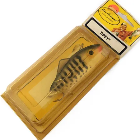Výrazné černé svislé pruhy definují barevný vzor tiger tohoto exempláře, jenž kontrastuje se žlutohnědým tělem a jasně oranžovým detailem u hlavy. Fred Arbogast Tipsy o hmotnosti 12 g (2/5 oz) se dochoval v nepoužitém stavu v původním dobovém blistru. Při délce 6 cm (2 1/4") je tato nástraha navržena tak, aby plavala na boku a napodobovala zraněnou rybku. Tato v USA vyrobená rarita, evidovaná pod produktovým kódem 18750, v sobě nese odkaz „Bait of Champions“, díky čemuž je často vyhledávána do soukromých sbírek. Zadní strana obalu obsahuje klasické ilustrace značky, které zdůrazňují její původ po boku legendárních modelů, jako je Jitterbug. Zlacené háčky jsou rozmístěny specificky tak, aby podporovaly unikátní chod nástrahy při plavání na boku.