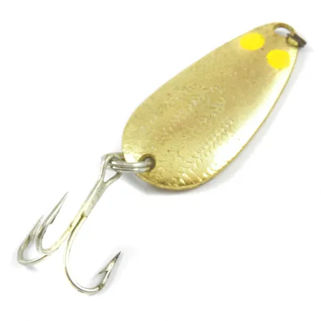 Pozlacený povrch a strukturovaný šupinatý vzor definují vizuální profil této plandavky Glen Evans 576. Dvě výrazné žluté tečky jsou umístěny na širším konci těla a poskytují ostrý barevný kontrast vůči kovovému povrchu. Na zadní straně je jasná ražba identifikující značku Glen Evans a číslo modelu 576, což potvrzuje její americký původ. Tento exemplář měří 4 cm (1 1/2") a váží 5,5 g (3/16 oz), přičemž si zachovává hodnocení stavu 4/5 s dobře zachovalým povrchem. Výbava zahrnuje originální spojovací kroužky pro upevnění vlasce a trojháček zajištěný na užším konci, vše katalogizováno pod kódem produktu 3245.