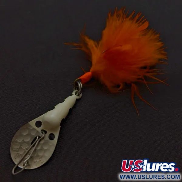Černé tečky na bílém smaltovaném povrchu vytvářejí výrazný kontrast na raženém kovovém těle této 1/4 oz (7 g) nástrahy. Glen Evans použil u modelu Gad-About charakteristickou dvoudílnou konstrukci s přední kovovou lžícovou částí, na které je vyražen název značky a modelu. V zadní části je k háčku přivázán bohatý trsy oranžových peříček ladící oranžovou nití, což zachovává jeho plný profil. Při délce 2" (5 cm) zůstává kování lesklé a bez oxidace. Tento konkrétní kus je zachován v kondici 5/5, přičemž lak i opeření vypadají stejně jako v den, kdy opustily továrnu.