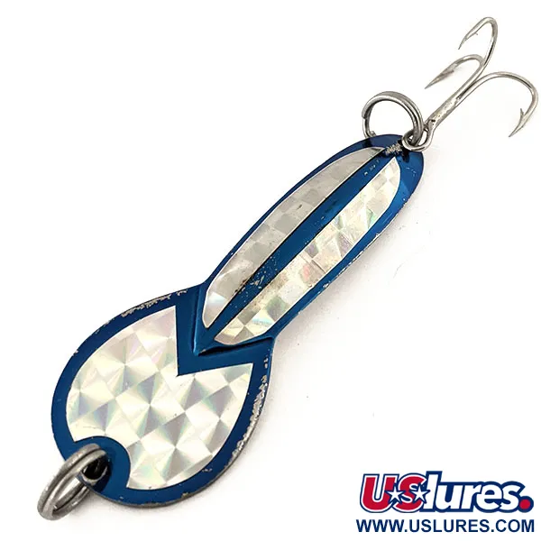 Sytě modrá lícní strana doplněná třpytivou stříbrnou holografickou páskou definuje tuto klasickou 17g (3/5 oz) plandavku. Tento exemplář, který je součástí historického katalogu Glen Evans pod produktovým kódem 13100, měří 7 cm (2 3/4") a představuje design, který později zpopularizovala značka Luhr Jensen. Přední strana je opatřena výraznou prizmatickou vložkou s diamantovým vzorem pro maximální viditelnost, zatímco zadní strana je vyvedena ve vysoce leštěném niklu s ostrým a čitelným nápisem „GLEN L. EVANS LOCO 3“. Nástraha je často využívána k lovu štik v mělkých stojatých vodách v hloubkách do 1 m a má robustní konstrukci pro nahazování i trolling. Hlavová i ocasní část jsou vybaveny kroužky, které na zádi drží ostrý trojháček. Tento konkrétní kus zůstává ve stavu 5/5, přičemž si zachovává svůj původní lesk na niklovém i prizmatickém povrchu.