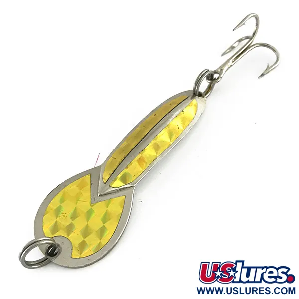 Reflexní zlatá prizmatická páska s diamantovým vzorem pokrývá lícovou stranu této 17g (3/5 oz) niklové plandavky a zachycuje světlo z mnoha úhlů. Na rubové straně je jasně vyraženo „GLEN L. EVANS LOCO“. Tento v USA vyrobený exemplář měří 7 cm (2 3/4 palce) a vyzdvihuje řemeslné zpracování spojené s vintage produkcí v USA. Tato konkrétní nástraha s kódem produktu 8400 je ve stavu 5/5 a udržuje si jasný povrch kovového těla i holografické prizmatické vložky. Je určena pro přívlač i trolling, často využívaná k lákání štik v klidných vodách v hloubkách do 1 m. Osazení zůstává robustní, obsahuje ostrý trojháček a pevné kroužky. Barevná kombinace Nikl / Zlato nabízí vysokou viditelnost v různých podmínkách čistoty vody.