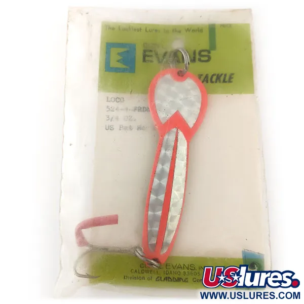 S váhou 3/4oz (23g) je tento plandavka s výrazným profilem klasickou volbou pro lov štik na stojatých vodách v hloubkách do 1 m (3.3ft). Tento model Glen Evans Loco 4, označený kódem 12100, disponuje vzorem Oranžová / Hologram, který zůstává vysoce viditelný díky svým UV-aktivním vlastnostem. Nástraha o délce 3 1/2" (9cm) byla vyrobena v Caldwellu v Idahu v době, kdy značka spadala pod Gladding Corporation. Jedná se o nepoužitý kus v původním balení s tovární kartonovou vložkou, vykazující pouze drobné známky stáří způsobené skladováním. Výbava zahrnuje zesílený kroužek pro upevnění vlasce a velký trojháček, jehož jeden hrot je kryt dobovou červenou bužírkou. Technické parametry naznačují, že nástraha nabízí hyperaktivní akci při nahazování i trollingu. Holografická fólie je precizně vsazena do oranžových okrajů, což je znakem řemeslného zpracování z éry před převzetím výroby firmou Luhr Jensen. Robustní kovový kroužek v očku zajišťuje spolehlivost při silných výpadech ryby.