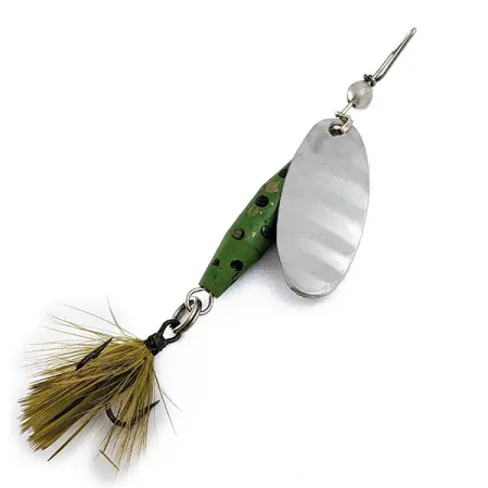 Poniklované rotační lístky definují klasický vzhled této nástrahy Shyster, jejíž design původně navrhl Glen Evans, než výrobu později převzaly značky jako Luhr Jensen. Tento kus o délce 7 cm a hmotnosti 7 g se vyznačuje výrazným zeleným tělíčkem doplněným černými tečkami. Trojhák s přírodním hnědým opeřením vytváří ve vodě jemnou siluetu a doplňuje odlesky stříbrného lístku. Jako jedna z raných amerických rotaček se Shyster stal základem výbavy rybářů lovících na stojatých jezerech i tekoucích potocích, přičemž pracuje efektivně i při velmi pomalém vedení. Tento konkrétní exemplář pocházející z USA nese produktový kód 17009 a představuje významný kus rybářské historie. Celkový stav nástrahy je vynikající s velmi dobře zachovalou povrchovou úpravou všech prvků, což odpovídá hodnocení stavu 5/5.