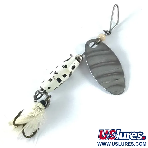 Výrazné bílé tělo s výraznými černými tečkami identifikuje tuto klasickou rotačku, design původně vyvinutý společností Glen Evans. Shyster váží 1/8 oz (4 g) a měří celkem 2 1/4" (6 cm) na délku a je vybaven charakteristickým přesazeným drátěným očkem navrženým tak, aby pomáhalo omezit kroucení vlasce. Tento konkrétní exemplář s kódem produktu 3661 má stříbrný list s typickým horizontálním žebrováním, které je základem rané americké výroby rybářského náčiní. Zadní trojhák je opatřen bílým peřím, které ocasní části dodává jemnější vizuální profil. Vyrobeno v USA, konstrukce zůstává robustní a stav 5/5 odráží velmi zachovalý kus s čistou povrchovou úpravou všech součástí. Na rozdíl od mnoha standardních inline rotaček je tato konfigurace mezi sběrateli známá svou schopností efektivně pracovat při nižších rychlostech navíjení jak v říčních proudech, tak v klidných jezerech.