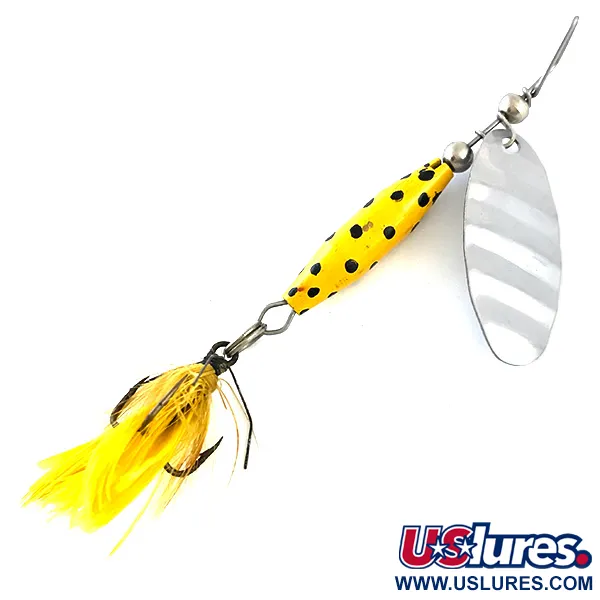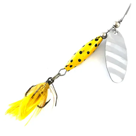Tato rotační třpytka s výrazným žlutým tělem a černými tečkami představuje kus americké rybářské historie od původního výrobce Glen Evans. Exemplář o hmotnosti 1/4 oz (7 g) a celkové délce 2 3/4" (7 cm) je vybaven listem z leštěného niklu s vyraženým názvem „Shyster“ a logem Glen Evans. Tento konkrétní kus s kódem 5382 je zachován ve stavu 5/5 s čistým lakem a lesklým hardwarem. Glen Evans byl průkopníkem tohoto designu v USA ještě předtím, než se stal standardem vyráběným dalšími slavnými značkami jako Luhr Jensen. Tělo je tvořeno zátěžovým kuželovým tvarem a trojháčkem se žlutým peřím, což je kombinace historicky využívaná pro pomalé vedení ve stojatých vodách i v proudech. Žluté peříčka jsou stále hustá a bezpečně upevněná k zadnímu trojháčku.