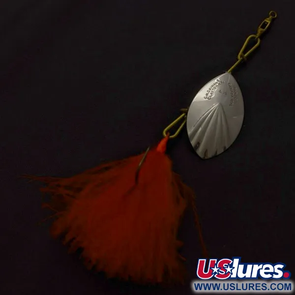 Tuto rotačku G.M. Skinner 4 charakterizuje nízká hmotnost 1/4 oz (7 g). Její design vychází z kanadského patentu z roku 1874. Poniklovaný list je elegantně rýhovaný pro zachycení světla a nese ikonickou ražbu výrobce, která odkazuje na původ v Claytonu, N.Y. Celková délka sestavy činí 4" (10 cm). Nástraha je doplněna háčkem s výrazným oranžovo-červeným peřím, které dodává kovovému profilu barevný akcent. Mosazné drátěné prvky a obratlík jsou mimořádně zachovalé, díky čemuž si tato rarita vysloužila hodnocení stavu 5/5. Tato nástraha s produktovým kódem 24225 demonstruje preciznost rané severoamerické výroby rybářského náčiní díky svému specifickému rýhování a robustní konstrukci.