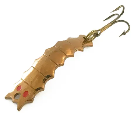 Segmentované měděné šupiny definují tělo této jedinečné plandavky ve tvaru larvy, vyrobené v USA. Al's Goldfish Helgy, produktový kód 6650, se vyznačuje prohnutým profilem navrženým tak, aby napodoboval vodní hmyz. Kovové tělo o délce 4,5 cm (1 3/4") vykazuje hluboké měděné tóny doplněné dvěma výraznými červenými tečkami u očka na vlasec. S hmotností 5,5 g (3/16 oz) je tento exemplář ukázkovým příkladem americké výroby rybářského náčiní, určený především pro nahazování v potocích nebo menších vodních plochách. Osazení zůstává ve špičkové formě a obsahuje pevný kroužek, který spojuje klasický trojháček v bronzové povrchové úpravě. Tato nástraha je ve stavu 5/5 a vykazuje jasný, rovnoměrný povrch na svém žebrovaném těle.