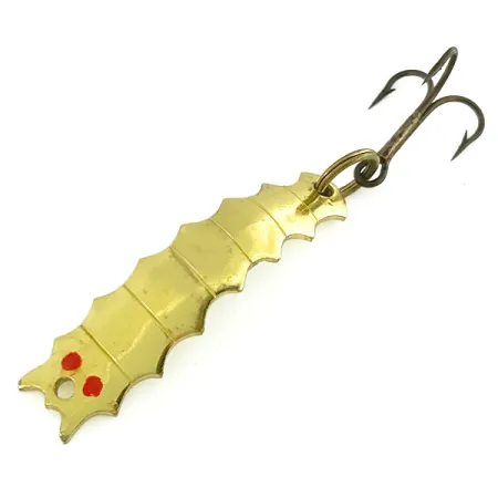 Tato historická mosazná plandavka, segmentovaná po celé délce tak, aby napodobovala larvu střechatky (hellgrammite), představuje unikátní kus historie amerického rybolovu. Společnost Al's Goldfish vyrobila tento model Goldfish Helgy, označený produktovým kódem 7244, s výrazně zakřiveným a vrubovaným profilem. Nástraha o délce 4,5 cm (1 3/4") má na hlavě dva ručně malované červené body sloužící jako oči, umístěné těsně nad předním očkem pro vlasec. Zadní strana těla je jasně ražena nápisem „GOLDFISH HELGY“, což zachovává čistou typografii typickou pro výrobu této značky v polovině století v USA. S váhou 4,5 g (3/16 oz) je tento exemplář ve stavu 5/5 a vykazuje jasný, reflexní povrch. Osazení tvoří jeden trojháček v bronzové úpravě připevněný přes kroužek na ocasu, připravený k nahazování v kamenitých potocích nebo rybnících.