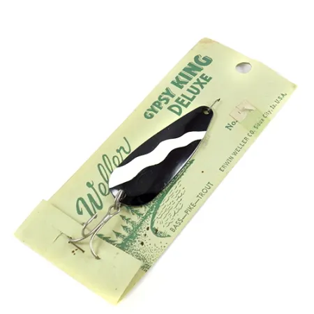 Výrazný bílý vlnitý pruh protíná sytě černý smalt na konvexní straně této klasické plandavky. S délkou 6 cm (2 1/4") a hmotností 11 g (2/5 oz) zůstává tento konkrétní model Weller Gypsy King 0 s produktovým kódem 2800 zachován na své původní prodejní kartě od společnosti Erwin Weller Co. ze Sioux City v Iowě. Tento model Deluxe má lesklou niklovanou zadní stranu a byl navržen pro lov okounů, štik a pstruhů. Exemplář je nepoužitý a vypadá přesně tak, jako když před desítkami let opustil továrnu. Vintage balení zdobí ikonické psací logo Weller a zelená jezerní grafika typická pro americké rybářské náčiní poloviny století. V zadní části je namontován ostrý trojháček, zatímco jednoduché drátěné očko indikuje určení pro přívlač nebo trolling.
