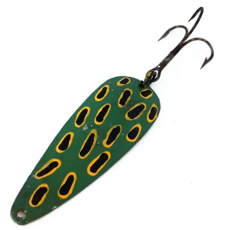 Tato vintage plandavka z USA o hmotnosti 17 g (3/5 oz) má vysoce kontrastní vzor Frog, typický pro danou éru. Kovové tělo o délce 7 cm (2 3/4") má tmavě zelenou přední stranu zdobenou černými skvrnami se žlutým okrajem, zatímco zadní strana je v jasně žluté barvě s jednoduchými černými tečkami. Tato konkrétní Gypsy King 1, vedená pod kódem 10334, má hodnocení stavu 4/5, vykazuje určité opotřebení laku a povrchové stárnutí, což jí dodává charakter, aniž by byla ohrožena pevnost. Nástrahy Weller jsou známé těmito typy zakázkových povrchových úprav a silný trojháček naznačuje, že byla navržena pro lov velkých sladkovodních dravců. Kovové části časem mírně ztmavly, ale zůstávají strukturálně v pořádku a jsou pevně uchyceny k zúženému konci těla ve tvaru kapky. Jedno očko v přední části nástrahy slouží jako přípojný bod pro nahazování nebo trolling.