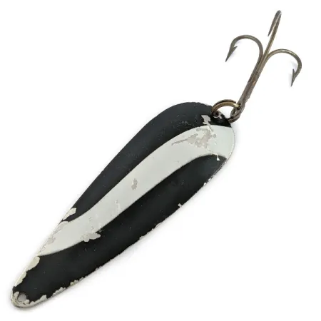 Tato ražená kovová plandavka z USA o délce 8,5 cm nese charakteristické označení Gypsy King. Přední strana s niklovým základem je opatřena vysoce kontrastním černo-bílým vzorem vln, přičemž vykazuje viditelné známky opotřebení odpovídající stavu 4/5. Na rubové straně z leštěného niklu je jasně vygravírován název Gypsy King 2. Tato plandavka Weller s produktovým kódem 19599 zůstává osazena původním robustním trojháčkem a spojovacím kroužkem. Tvar kapky a vyšší hmotnost 21 g jsou typickými znaky nástrahy určené pro daleké nahazování nebo trolling ve velkých hloubkách. Drobné oděrky barvy na hranách dodávají tomuto exempláři z poloviny minulého století na autenticitě, aniž by byla narušena jeho celková integrita.