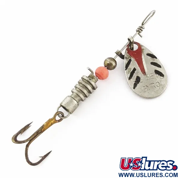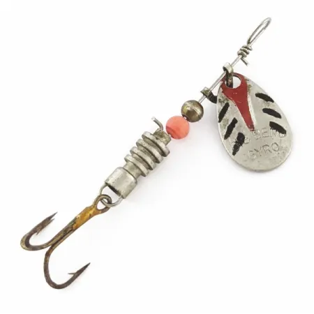 Na stříbrném listu typu vrbový list je zřetelně vyraženo označení „BIG BEND GYRO“, což je charakteristický znak této vzácné vintage nástrahy vyrobené v Japonsku. S délkou 5,5 cm a jemnou hmotností 2,5 g tato nástraha představuje precizní řemeslné zpracování typické pro japonský export z poloviny minulého století. Tělo tvoří skládané vroubkované kovové segmenty doplněné jedním výrazným oranžovým korálkem a stříbrnou kulovou rozpěrkou, která umožňuje volnou rotaci sestavy listu na drátěné ose. Ručně nanášené černé šikmé pruhy a výrazný červený šíp zdobí list a dodávají vizuální kontrast leštěnému kovu. Tento exemplář s produktovým kódem 24391 je osazen originálním trojháčkem a zachoval se ve výjimečném stavu 5/5, s velmi dobře udržovaným lakem i kovovými prvky. Drátěná osa je zakončena tradičním ručně vinutým očkem, což byl běžný konstrukční prvek rotačních třpytek pro lehkou přívlač v tomto období.