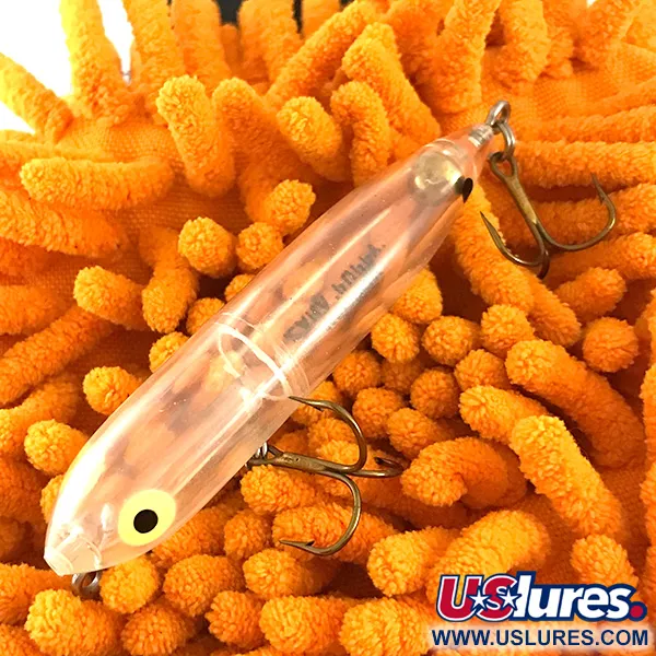 Tato nástraha Heddon Zara Puppy s výrazným černým nápisem na průhledném plastovém boku představuje rafinovanou variantu s menším profilem z legendární řady walking-baitů. S délkou 3 1/4" (8 cm) a váhou přesně 1/4 oz (7 g) je tento exemplář ideální volbou pro napodobení menší potravy. Průhledné provedení zdůrazňuje vnitřní konstrukci a odhaluje mosazné závaží v zadní části a jednoduchou mechaniku pod výraznýma žlutýma očima s velkými černými zornicemi. Nástraha s produktovým kódem 6483 si zachovává původní osazení se dvěma trojháčky na břiše a ocase ve stavu 5/5. Jako hladinová nástraha je konstruována pro klasické vedení typu "walk the dog", které na hladině vytváří rytmický pohyb ze strany na stranu. Tato klasika vyrobená v USA si zachovává velmi čistý povrch celého průhledného těla.