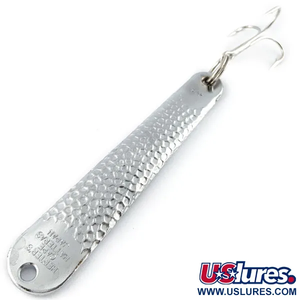 Ražba na spodní straně tohoto 10cm (4") kovového pilkru jasně určuje, že se jedná o model Herter's Cape Hatteras, což je jméno dlouhodobě spojené s náročným mořským rybolovem z břehu ve středním Atlantiku. S hmotností solidních 42 g (1 1/2 oz) se tato nástraha vyznačuje specifickým tepaným povrchem ve stříbrném tónu, který je navržen tak, aby odrážel záblesky světla do všech směrů. Tento konkrétní model S2 nese označení „Japan“, což odráží éru, kdy společnost Herter’s odebírala robustní komponenty ze zámoří, aby splnila své pověstné standardy vynikajícího poměru kvality a ceny. Chromování zůstává v prvotřídním stavu a za svůj brilantní zrcadlový lesk získává hodnocení 5/5. V přední části se nachází široké očko připravené pro zátěžový kroužek nebo přímý návazec, zatímco konec je osazen velkým originálním trojháčkem upevněným na pevném kovovém kroužku. Při pohledu na profil se ploché tělo směrem k háčku mírně zužuje, což zajišťuje aerodynamický tvar pro daleké nahazování z pláže nebo mola. Osazení nevykazuje žádné známky opotřebení, hroty háčku jsou stále ostré a kovové povrchy jsou bez jakýchkoli vad. Kód produktu 19496.