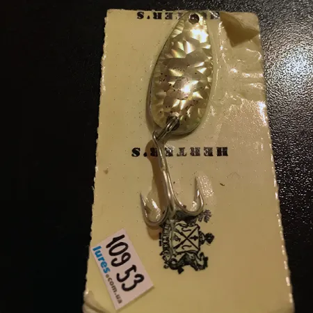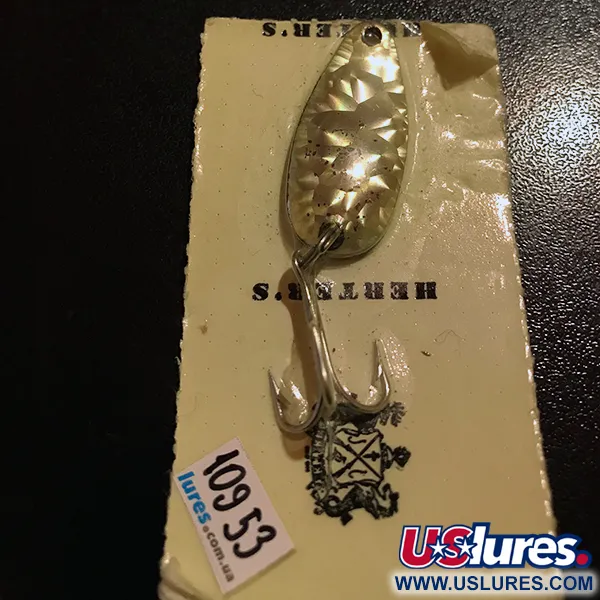 V Japonsku vyrobená plandavka Herter's Crystal o hmotnosti 3/16 oz (6 g) využívá mnohostranně tepaný povrch k vytvoření třpytivého vizuálního efektu. Tato nástraha s produktovým kódem 10953 měří 1 1/2" (3,5 cm) na délku a zachovává si jasný, čistý povrch charakteristický pro nepoužitý kus. Design lžíce, často spojovaný s přívlačí na pstruhy nebo okounovité ryby, spoléhá na své kovové fazety, které odrážejí světlo ze všech úhlů. Zůstává připevněna k původní kartě 'Herter's', která zobrazuje ikonický firemní znak a vintage typografii. Osazení tvoří jeden stříbrný trojháček spojený robustním kroužkem, přičemž oba prvky nevykazují žádné známky stáří nebo opotřebení. Vzhledem k tomu, že je hodnocena stavem 6, je nástraha nepoužitá a vypadá přesně tak, jako když před desítkami let opustila továrnu.