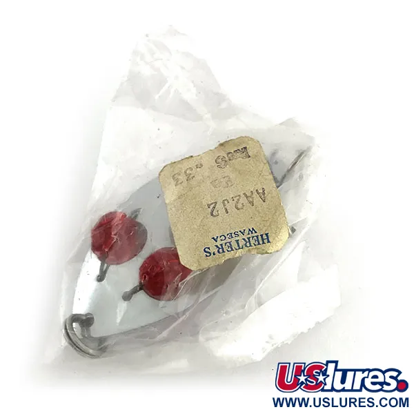Červené skleněné oči jsou zasazeny přímo do poniklovaného těla této plandavky Herter's Glass eye spoon, což je výrazný designový prvek z éry po druhé světové válce. Tyto nástrahy byly vyráběny v okupovaném Japonsku pro ikonickou americkou outdoorovou značku, čímž propojily globální produkci s jejími kořeny ve Wasece v Minnesotě. S váhou 11 g (2/5 oz) a délkou 5,5 cm (2 1/4") poskytuje plandavka výrazný profil pro sladkovodní přívlač nebo trolling. Na zadní straně je do kovu vyražen název výrobce a lokalita. Tento konkrétní exemplář je nepoužitý, stále uložený v původním průhledném plastovém sáčku s dobovou papírovou visačkou označenou AA2J2 a původní cenou 33 centů. Niklový povrch zůstává jasný a dvě červené skleněné oči jsou bezpečně usazeny. Nástraha s produktovým kódem 8987 obsahuje v přední části kroužek pro přímé připojení k návazci nebo obratlíku.